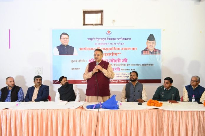 कैबिनेट मंत्री गणेश जोशी ने रविवार को देहरादून के मसूरी विधानसभा क्षेत्र के अंतर्गत आर्यनगर में मसूरी देहरादून विकास प्राधिकरण देहरादून की अवस्थापना निधि मद से स्वीकृत ₹35 लाख की लागत से नव निर्मित सामुदायिक भवन लोकार्पण किया।