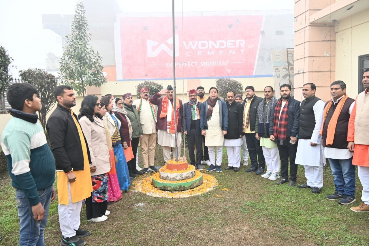 रुद्रपुर स्थित भाजपा के जिला कार्यालय में ध्वजारोहण करते जनपद प्रभारी मंत्री गणेश जोशी