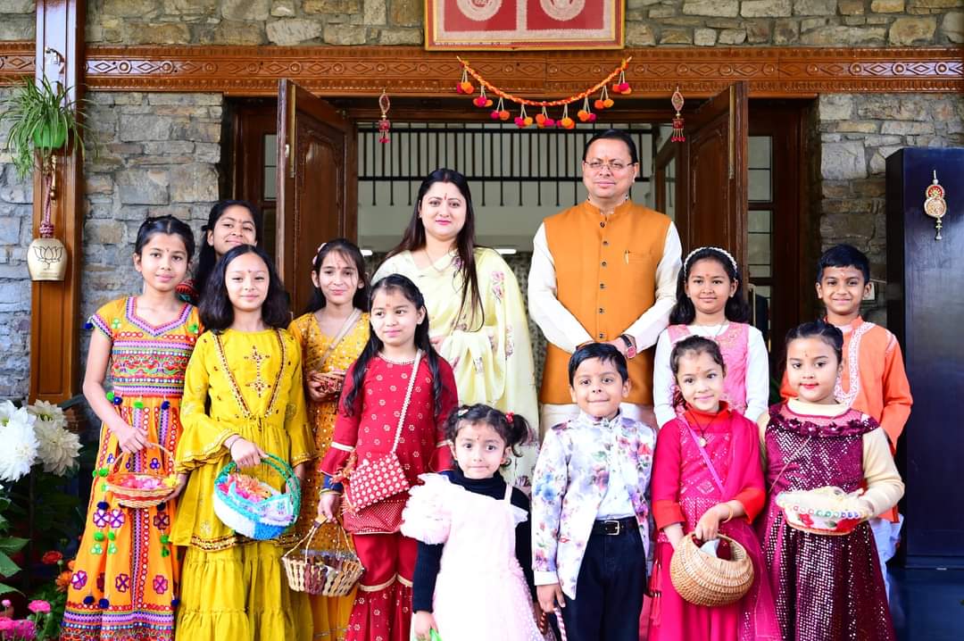 मुख्यमंत्री धामी की उपस्थिति में मुख्यमंत्री आवास में रंग बिरंगे परिधानों में सजे बच्चों ने देहरी में फूल व चावल बिखेरकर पारंपरिक गीत ‘फूल देई छमा देई, जतुक देला, उतुक सई, फूल देई छमा देई, देड़ी द्वार भरी भकार’ गाते हुए त्योहार की शुरुआत की