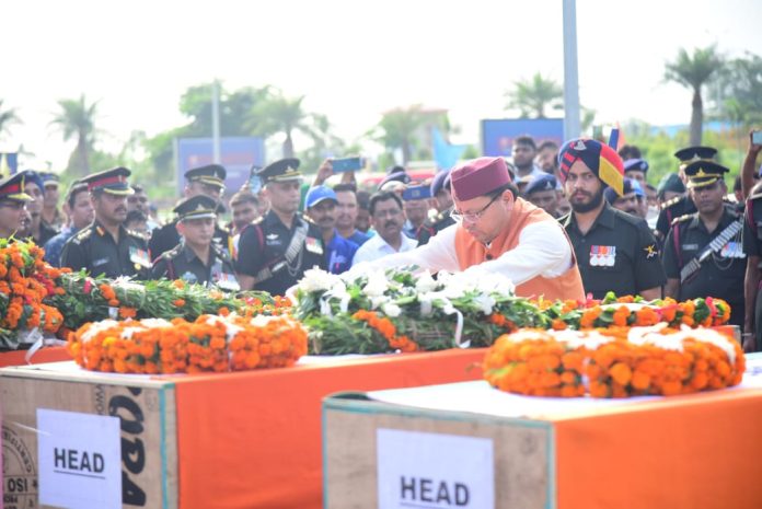 मुख्यमंत्री पुष्कर सिंह धामी ने पांचों शाहिद जवानों के पार्थिव शरीर पर पुष्प चक्र अर्पित कर संपूर्ण राज्य की ओर से उन्हें श्रद्धांजलि अर्पित की