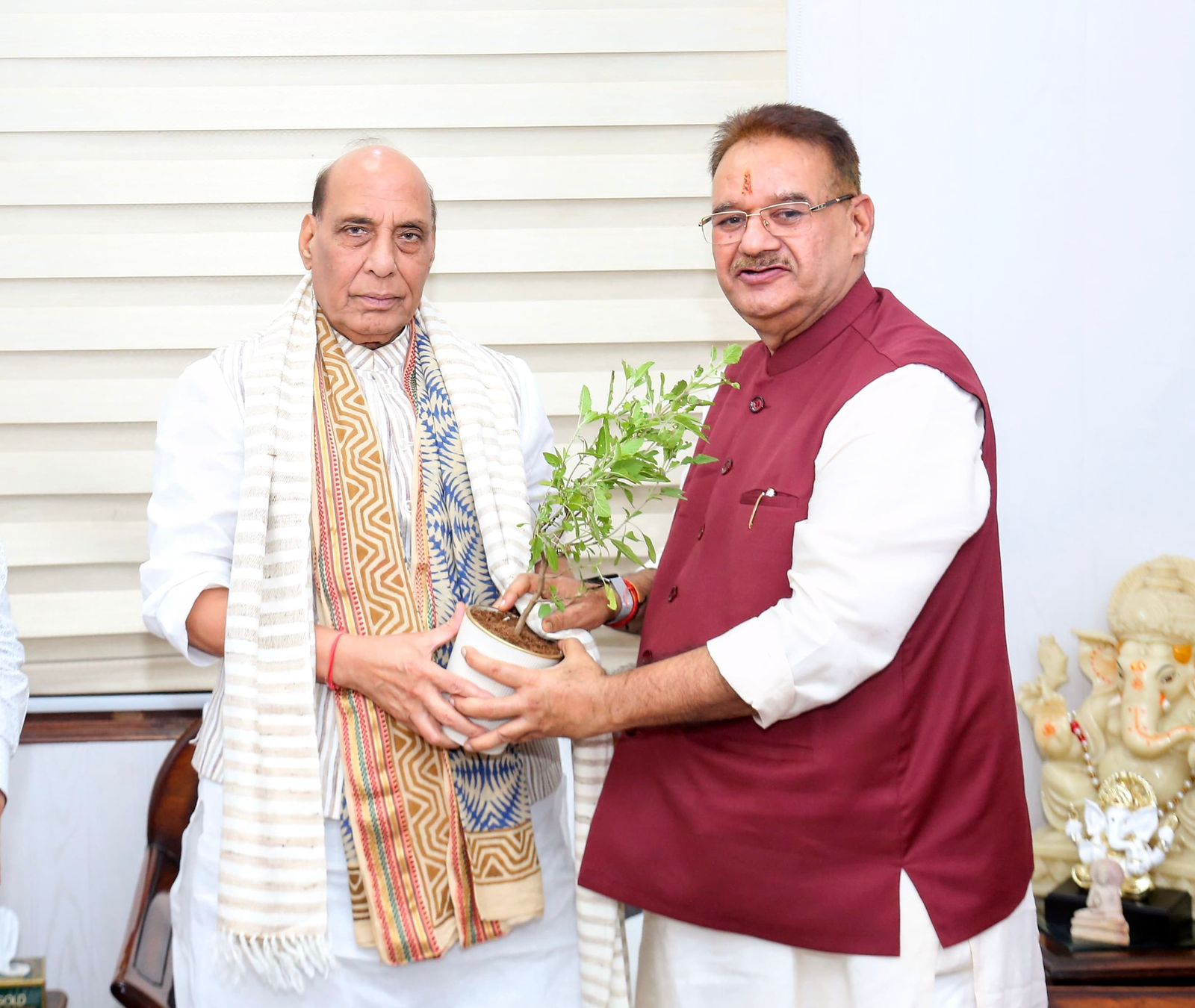 नई दिल्ली में रक्षा मंत्री राजनाथ सिंह से मुलाकात कर उन्हें तुलसी का पौधा भेट सैनिक कल्याण मंत्री गणेश जोशी ने किया