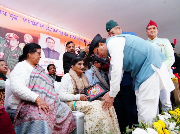 मुख्यमंत्री श्री पुष्कर सिंह धामी ने कहा कि इस युद्ध में पाकिस्तान के लगभग एक लाख सैनिकों ने 16 दिसंबर 1971 को हमारी सेना के समक्ष आत्मसमर्पण किया, जो दुनिया के सैन्य इतिहास में एक अद्वितीय घटना के रूप में दर्ज है। उस युद्ध में लगभग 39 सौ भारतीय सैनिक वीरगति को प्राप्त हुए, जिनमें वीरभूमि उत्तराखंड के 255 बहादुर सपूत भी शामिल थे। तब हमारे प्रदेश के 74 सैनिकों को अपने अदम्य साहस और शौर्य के लिए विभिन्न वीरता पदकों से सम्मानित भी किया गया था।