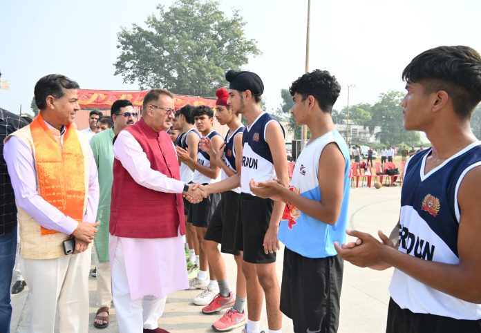 : हरिद्वार में आयोजित 21वीं यूथ स्टेट अंडर-16 बास्केट बॉल बालक बालिका प्रतियोगिता के समापन कार्यक्रम में प्रतिभाग करते कैबिनेट मंत्री गणेश जोशी।