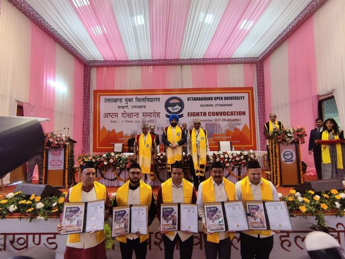 उत्तराखंड मुक्त विश्वविद्यालय के अष्टम दीक्षांत समरोह में राज्यपाल (रि.) लेफ्टिनेंट जनरल गुरमीत सिंह, मुख्यमंत्री पुष्कर सिंह धामी एवं उच्च शिक्षा मंत्री डॉ. धन सिंह रावत ने 21 छात्रों को विश्वविद्यालय स्वर्ण पदक, दो छात्रों को कुलाधिपति स्वर्ण पदक एवं तीन प्रायोजक स्वर्ण पदक प्रदान किये। इसके साथ ही पांच छात्रों को पीएचडी की उपाधि तथा विभिन्न विद्याशाखाओ में 15417 को स्नातक और स्नाकोत्तर की उपाधि प्रदान की गई। इस दौरान राज्यपाल एवं मुख्यमंत्री ने मुक्त विश्वविद्यालय के कॉसैप्ट की सराहना की, साथ ही उन्होंने सभी छात्रों के उज्ज्वल भविष्य की कामना की। उच्च शिक्षा मंत्री डॉ. धन सिंह रावत ने कहा कि उच्च शिक्षा के क्षेत्र में राज्य सरकार ने तीन बड़े कदम उठाये हैं जिसमें प्रत्येक छात्र-छात्राओं का अब डीजी लॉकर के माध्यम से डिग्रियां दी जायेगी। दूरस्थ शिक्षा में एडमिशन लेने वाले छात्र-छात्राओं को निःशुल्क पुस्तकें वितरित की जायेंगी। परीक्षा परिणाम समय पर घोषित हों इसके लिये प्रत्येक विश्वविद्यालयों में केन्द्रीय मूल्यांकन व्यवस्था लागू की जायेगी इसके लिये पीएम-रूसा से तहत विश्वविद्यालयों को 20-20 करोड़ की धनराशि आवंटित की जायेगी।